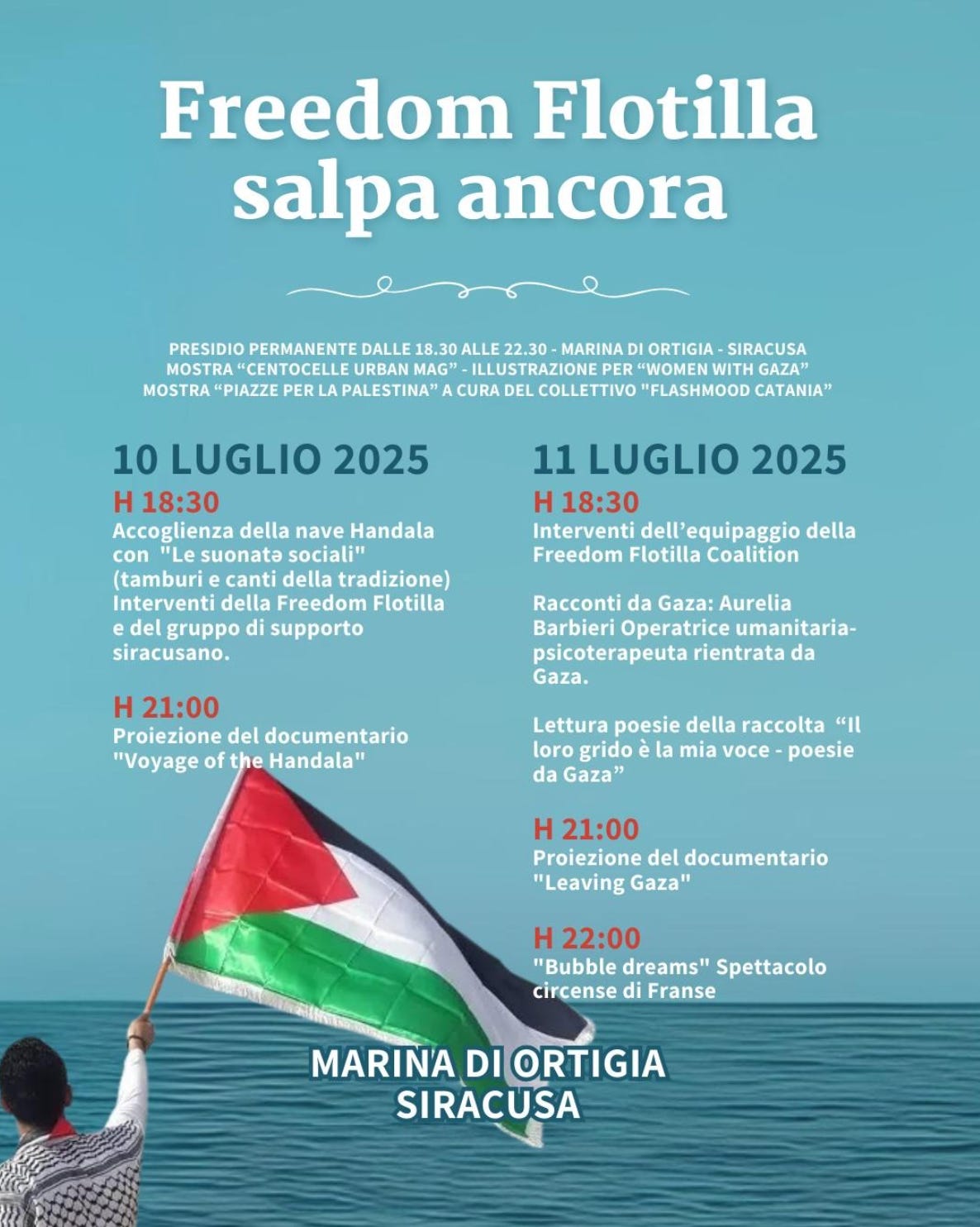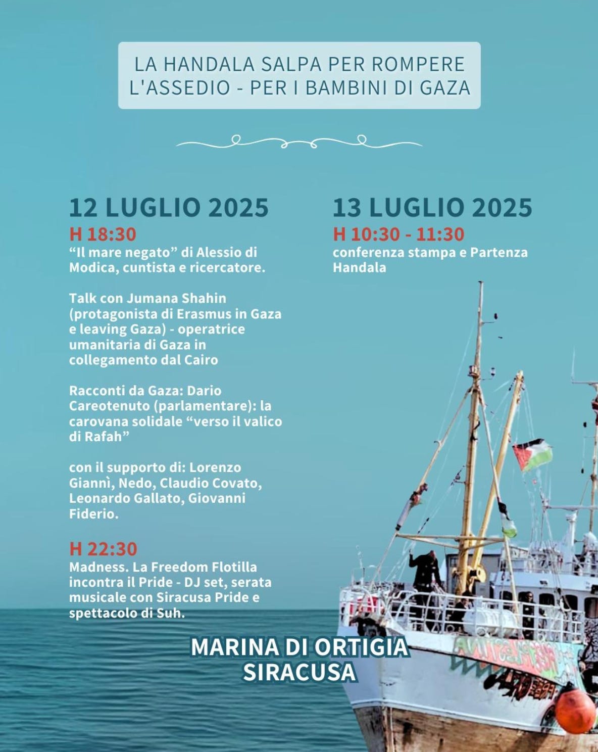 The flotilla ship Handala moved on July 10 from its port for the past year, Augusta, Sicily to its mission launch site in Siracusa, Sicily. Local organizers in Siracusa have created multiple events for the citizens of Sicily to join in challenging the ongoing Israeli genocide of Gaza.