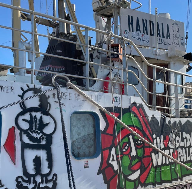 Named after the Palestinian cartoon figure Handala—a barefoot refugee child who turned his back on injustice and vowed not to turn around until Palestine is free—this boat carries his spirit, and that of every child in Gaza who has been denied safety, dignity, and joy.
